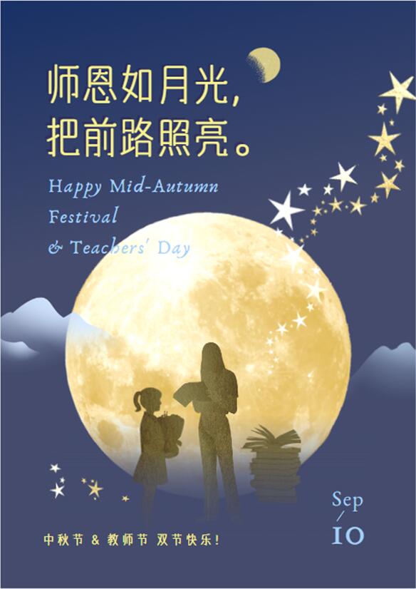 桃李满天下,师恩重如山花好月圆夜,中秋共团圆月光长长照万里愿您只生欢喜把双节合一,让祝福成双老师们,向您道一声:中秋节快乐!教师节快乐!