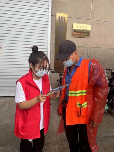 实践队员们深知有效切断疫情扩散蔓延渠道,就必须把社区这道防线守住。为此他们进入居民社区、商铺、主流干道等人流量较多的区域,派发防疫宣传单,将“三个重点”、“四早”、“四应四进”、“五个到位”传递给居民,耐心为人们讲解国内疫情现状、疫情常态化下社区如何防范、怎样正确保持卫生等知识,认真开展入户疫情防控赋能宣传工作。