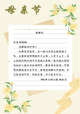 母亲,平凡而伟大有一双手,给予我们温暖,有一双眼,给予我们关怀;有一个人,赋予我们生命与力量。那就是母亲,一个最平凡而又最伟大的人。我们迎来一年一度的母亲节,在这个温暖的日子里,让爱与感恩轻轻流淌。为了增强学生的感恩意识,懂得珍惜亲情,丰富学生的情感世界,增强社会责任感,培养健康心态,塑造健全人格,为同学的爱创造一个展现平台,以此激发同学们大胆表达对母亲的爱。特此,软件学院新媒体指导中心举办“感恩母亲,臻爱献礼”作品征集活动。