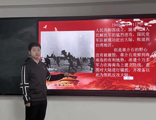 2022级网络空间安全一班的孙嘉慧同学和网络空间安全三班的李新学同学主要介绍了海南岛解放的过程。1949年10月,逃到海南岛的国民党海陆空军残部共约10万人,构筑工事,布设阵地,企图长期盘踞。人民解放军第四野战军的两个兵团,先于1950年3月5~31日,在琼崖纵队接应下,相继派遣两个团又三个营分批偷渡登陆,以加强岛上的接应力量。4月16日,解放军主力在无海空军配合的情况下,发起渡海登陆作战,冲破敌海陆军的重重拦阻,在琼崖纵队和先期登陆部队的接应下,胜利登陆,经连续作战,共歼敌三万余人,余敌由海上逃窜。至5月1日,全部解放海南岛。