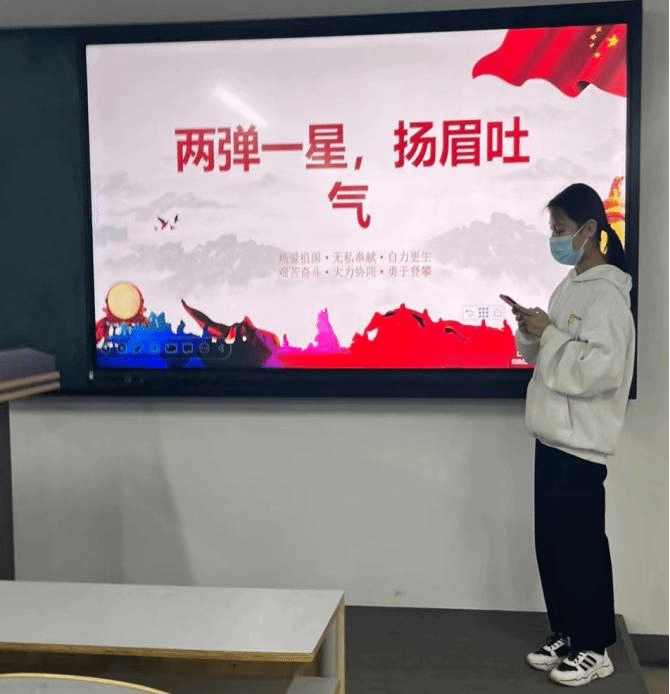 几位同学在演讲前做了充足准备,浏览和查阅相关资料,站在讲台上侃侃而谈,为同学们生动讲解两弹一星的故事。