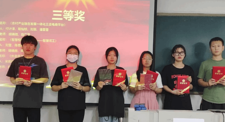 决赛中,经软件学院相关专业评审老师评定,最终,由胡晓微、白广平老师带领李常健等同学的《安林应用科技工作室》项目,获得一等奖,《猛牛跑腿》、《悦洗悦新》、《闲置不嫌》项目获得二等奖,《及时伞》《农村产业融合发展一体化三卖电商平台》《智慧校园软件开发——智慧河工》《基于5G并结合自动驾驶的城市出租车项目》《校园轻食小店》《外卖员之家》等获得三等奖。5月20日晚,由软件学院教学副院长刘翠焕院长给获奖团队颁奖.