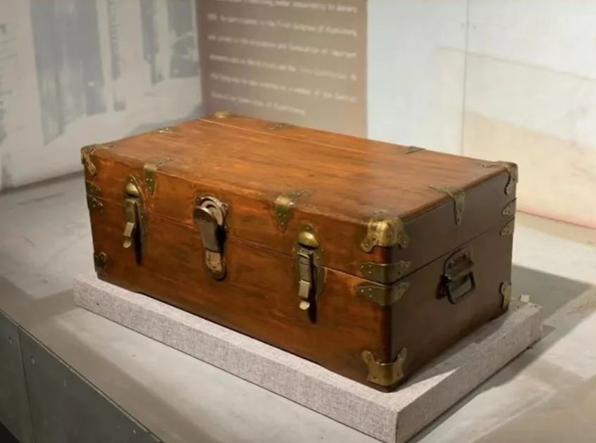 这对樟木书箱是1924年1月,李大钊到广州参加国民党一大时为了保存会议重要文件购买的,他总是把一些重要的文件或书籍珍藏在里面。李大钊牺牲后,夫人赵纫兰睹物思人,把这对樟木书箱带到了故乡乐亭,一直保存到今天。这对樟木书箱也可以说是李大钊促成国共首次合作的历史见证。现已经被鉴定为国家一级文物。